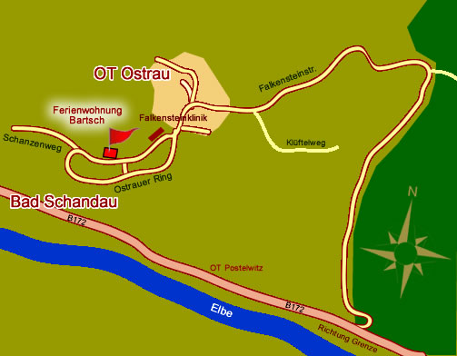 Anfahrt von Dresden über die A17 bis Abfahrt Pirna und weiter in Richtung Pirna - Bad Schandau. Sie kommen direkt auf die B172, fahren immer Hauptstraße bis Bad Schandau und weiter in Richtung Grenze. Am Ausgang vom Ortsteil Postelwitz biegen Sie links ab von der B172 in Richtung Ostrau - Falkensteinklinik. Nach der Falkensteinklinik kommen Sie rechts zu unserer Ferienwohnung. |